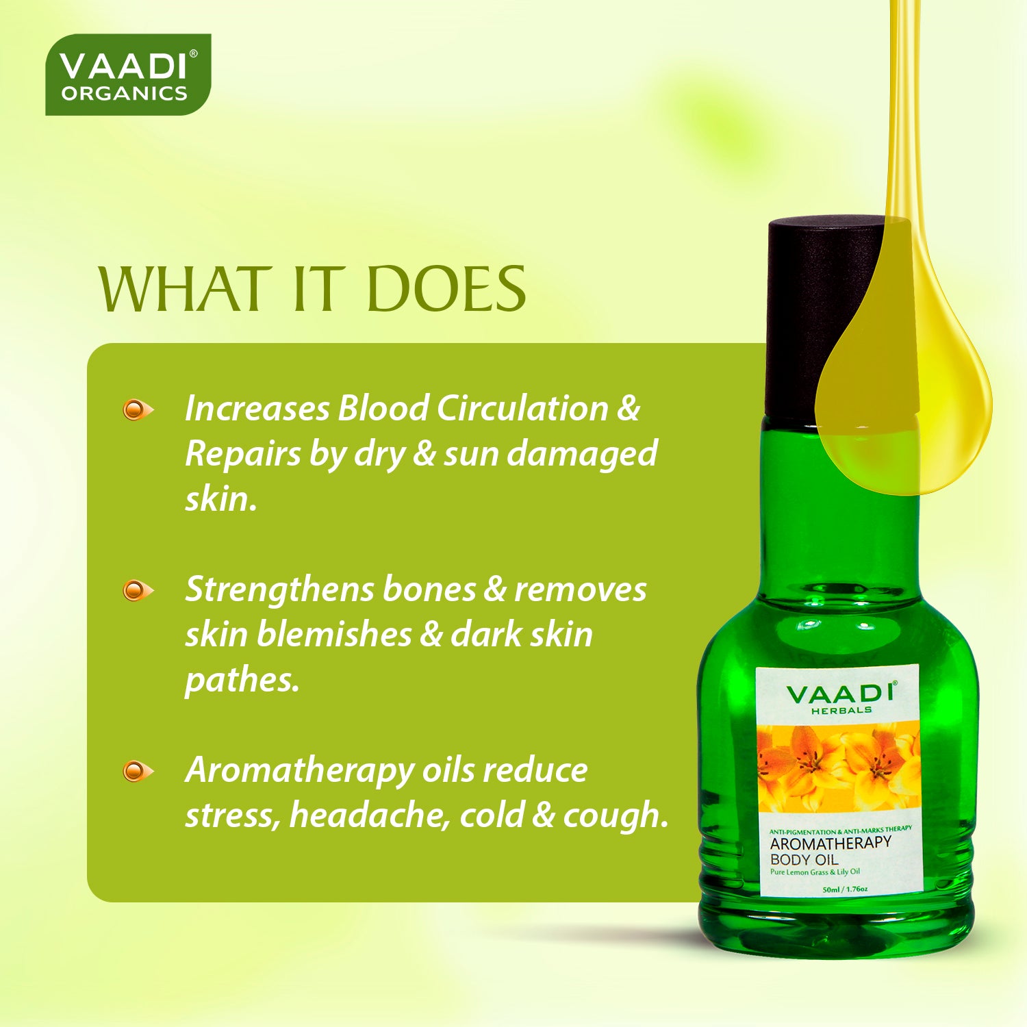 Increases blood circulation & repairs dry & sun damaged skin. Strengthens bones & removes skin blemishes & dark skin patches. Aromatherapy oils reduce stress, headache, cold & cough