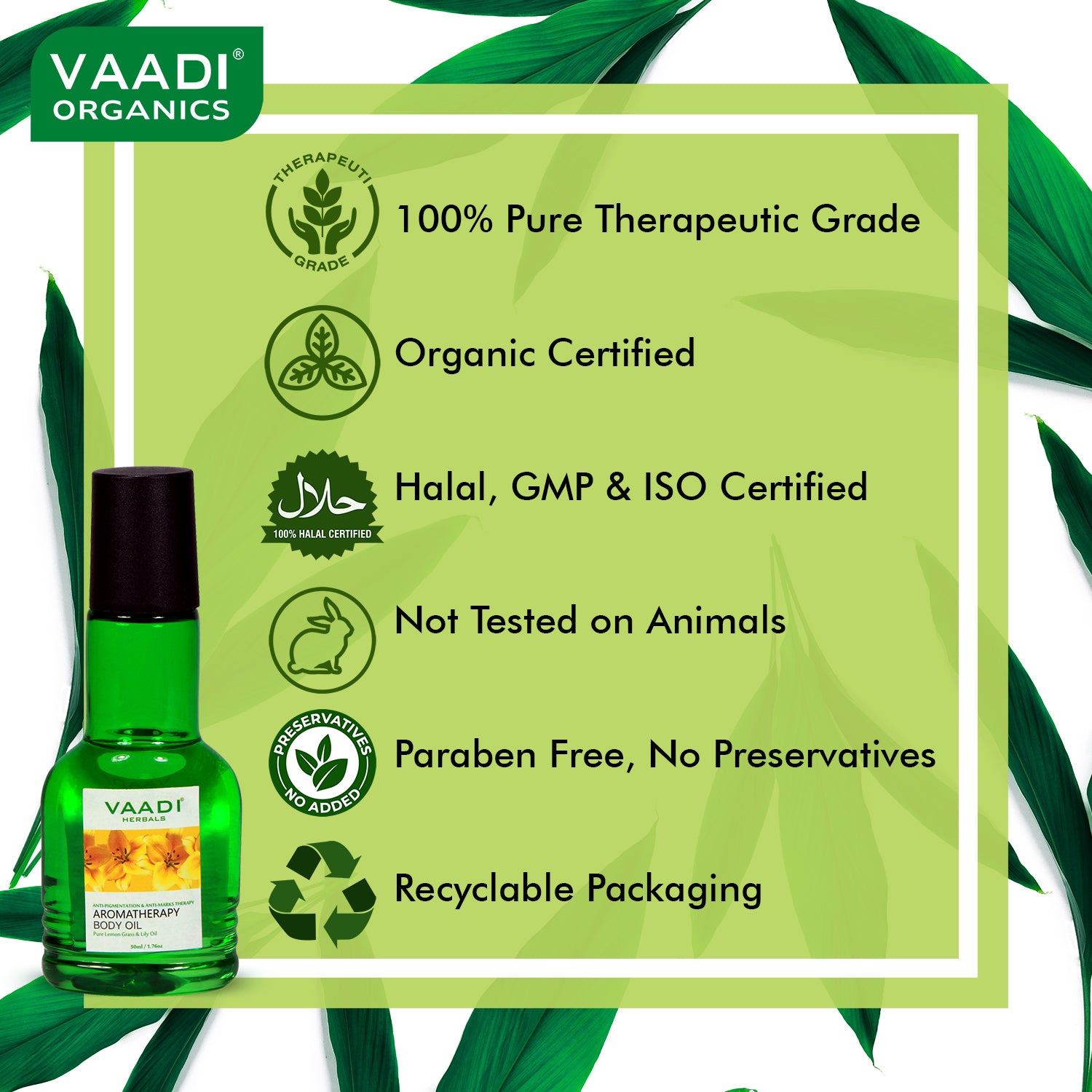 This is the best body oil that I have used. I am very regular with massages and have been trying different oils. This is one of my best discoveries. The pure lemongrass and lily oil in this products gives a very soothing and soft feel to the skin. The skin absorbs the oil in seconds and there is no stickiness. I love this product. My son uses the Vaadi organic Aromatherapy Lavender and Almond Oil and loves it. Would highly recommend these two oils from Vaadi.