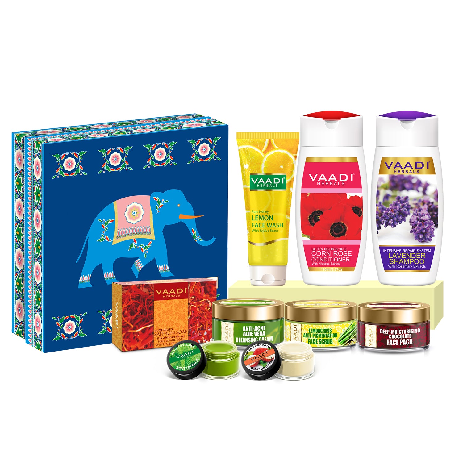 This exquisite gift box with a royal elephant on the cover has a true rich Indian tradition feel to it. It comprises of 8 products such as a conditioner, an aromatic soap, a gentle face wash, a nourishing cleansing cream, a face scrub, a rich face pack and 2 delicious lip balms. This set is excellent for gifting purpose on any occasion and the products are suitable for all skin and hair types